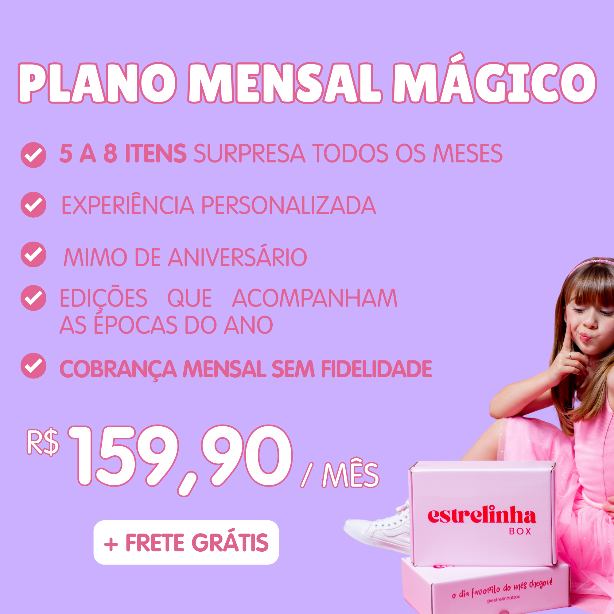 A Estrelinha Box é uma assinatura mensal infantil para meninas de 1 a 12 anos. Todos os meses, sua filha recebe em casa uma box com 5 a 8 itens surpresa, escolhidos com carinho de acordo com a idade e as preferências informadas no cadastro.